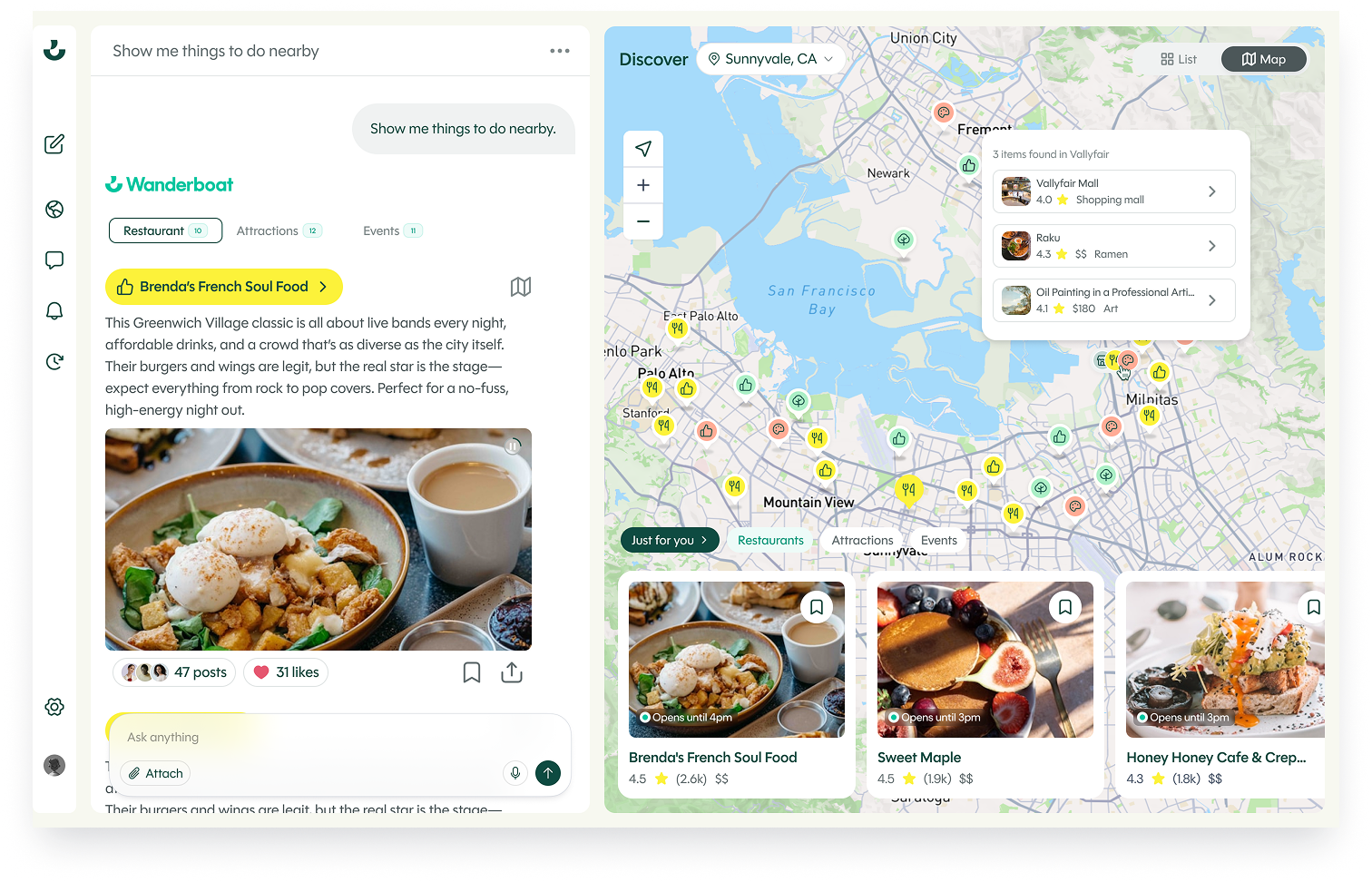 2. Established visual hierarchy by giving the right screen more space for exploration and discovery, dedicating room to rich visuals of events, restaurants, and activities to drive engagement, while keeping the left chat panel compact and accessible to support without competing for attention.